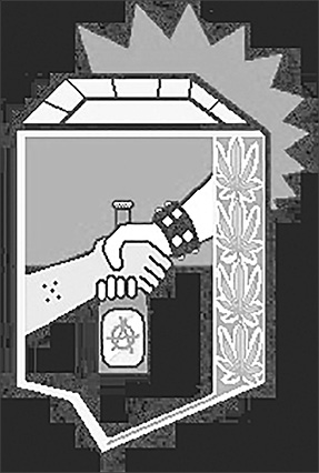 Fig.: Banner del blog anarco-peronista anarkoperonismo.blogspot.com (acc. 1/8/2013). Cerveza en vez de pica, hojas de marihuana en lugar de laureles y un brazo de piel amarronada con un símbolo antipolicial (popular entre jóvenes de las clases bajas), entrelazada con otra de tez más clara con un brazalete punk.
