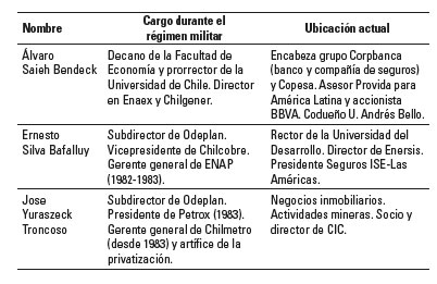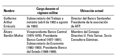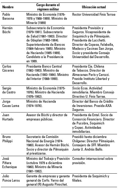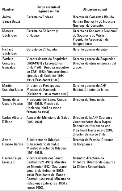 Junto a ellos destacan entre los más significativos los nombres del actual senador y ex ministro del Interior Sergio Fernández Fernández, cuyo socio Vasco Costa, también ex ministro del Trabajo, estuvo vinculado a la privatización de Telex Chile; del ex canciller y ex presidente del Banco Central Hernán Felipe Errázuriz, quien se ha desempeñado en el último tiempo como abogado personal de Pinochet; del ex subsecretario del Trabajo Guillermo Arthur, actual presidente de la Asociación de AFP; del ex ministro secretario general de Gobierno y de Vivienda Miguel Ángel Poduje, quien después de 1990 ha contribuido a afianzar el imperio económico financiero de Álvaro Saieh —uno de los más influyentes civiles entre los militares—, y de Jorge Selume, quien fuera director de Presupuesto bajo la dictadura. Saieh y su grupo son los actuales dueños, entre otras empresas, del Consorcio Periodístico de Chile (Copesa), que edita los diarios La Tercera, La Hora, La Cuarta y la revista Qué Pasa.