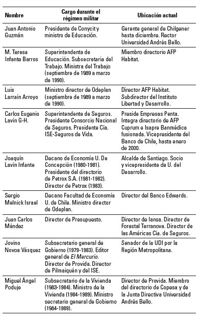 Pero al revisar lo que ocurre hoy en el escenario económico, se advierte un fenómeno: los Chicago boys y los ejecutivos ligados a la UDI, es decir los civiles que formaron parte de esa alianza, mantienen sus lazos, sus posiciones de poder y las consiguientes regalías económicas. Ex ministros, ex subsecretarios, los que fueron directores de servicios y asesores están presentes hoy en los directorios de las empresas que ellos mismos contribuyeron a privatizar. Estos son prósperos hombres de negocios que encabezan grupos económicos, que influyen en el destino de los fondos previsionales de los trabajadores, a través del control de las AFP, y que ocupan cargos en los directorios de las empresas privadas. Sus influencias alcanzan variadas y fundamentales áreas de la producción y de servicios.