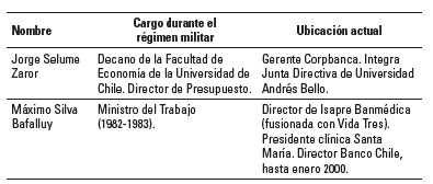 Fuentes: Los datos sobre cargos en el régimen militar son de recopilación efectuada por la autora en investigaciones anteriores. Los antecedentes actuales sobre directorios de empresas, AFP e Isapres corresponden a septiembre de 2000, obtenidos en la Superintendencia de Valores y Seguros, donde periódicamente son entregados por las sociedades anónimas abiertas, actualizados de acuerdo a información de prensa. Las referencias a directores de bancos son de febrero de 2000 publicados en el Boletín de la Superintendencia de Bancos del primer semestre. Los de universidades han sido recogidos de la información entregada por las propias universidades (página web u otras publicaciones) y de la prensa.