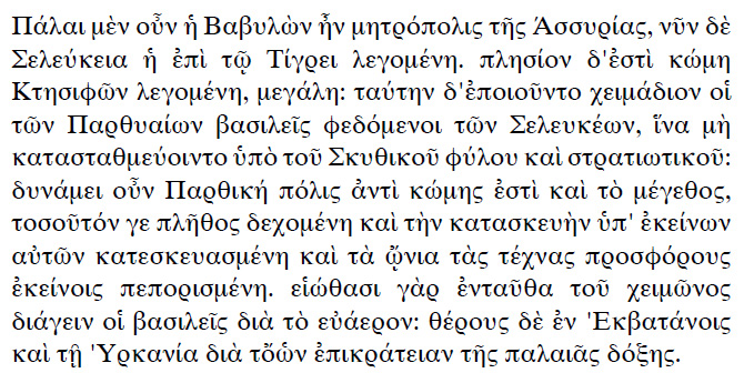 [En tiempos antiguos, Babilonia era la metrópolis de Asiria, pero ahora Seleucia es la metrópolis; es decir, Seleucia del Tigris, tal y como se la denomina. Allí cerca hay una ciudad llamada Cesifonte. En esta población ubicaron los reyes de Partia su capital de invierno, de forma que los habitantes de Seleucia no se veían obligados a convivir con las tropas escitas de los partos. Debido al poder parto, Cesifonte era una ciudad, más que una pequeña población. Era de tal tamaño que podía albergar a numerosos habitantes y en ella los propios partos habían erigido aún más edificios, con grandes almacenes para el comercio y otras construcciones para las artes que les resultaban placenteras, y es que a los reyes partos les encantaba pasar el invierno allí por la salubridad del aire, pero en verano regresaban a Ecbatana e Hircania por su mayor renombre.]9