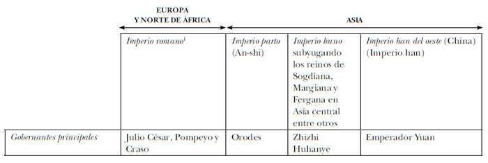 En la época de la legión perdida, el mundo se dividía en tres grandes imperios: la República de Roma (en transición ya hacia su formato imperial), el Imperio parto y el Imperio han de China. Entre el Imperio parto y el Imperio han estaban los reinos de Sogdiana, Margiana o Fergana, entre otros, que caerán bajo el poder brutal del Imperio huno de los hermanos Zhizhi y Huhanye.