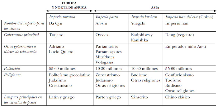 En la época de Trajano, el mundo había cambiado y en lugar de tres había cuatro grandes imperios: el Imperio romano, el Imperio parto, el Imperio kushan del norte de la India y el Imperio han. El territorio de los hunos había pasado a ser controlado por los kushan, y los hunos (o hsiung-nu) se desplazaron más al norte.