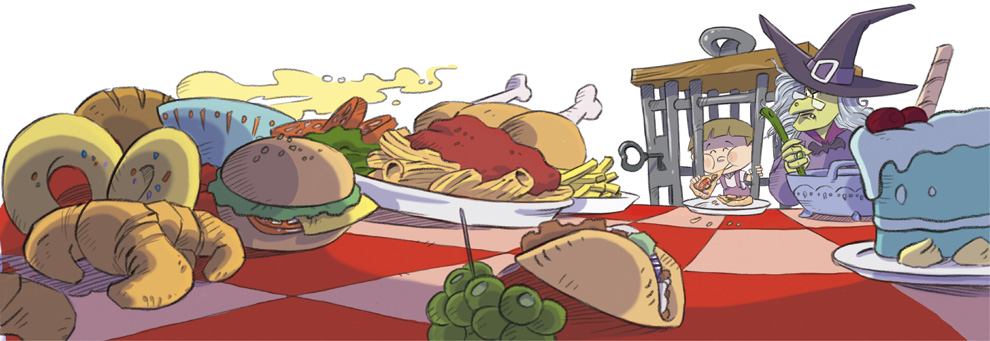 A pesar de que estaba muy asustado, Hansel se iba zampando todos los platos que aquella vieja le preparaba, pues cocinaba muy bien. ¡Qué lástima que se los quisiera comer...! Si encontraran el modo de convencerla para que no lo hiciera, pensaba Gretel al oler aquellos guisos tan buenos.