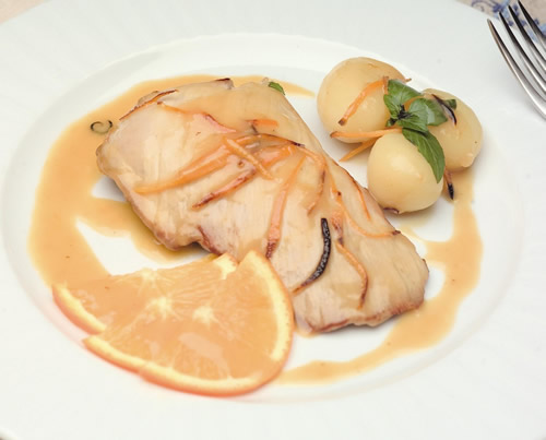 Servir los secretos salpimentados y salseados con la salsa de naranja y guarnecer con las patatas asadas. Decorar con el perejil.
