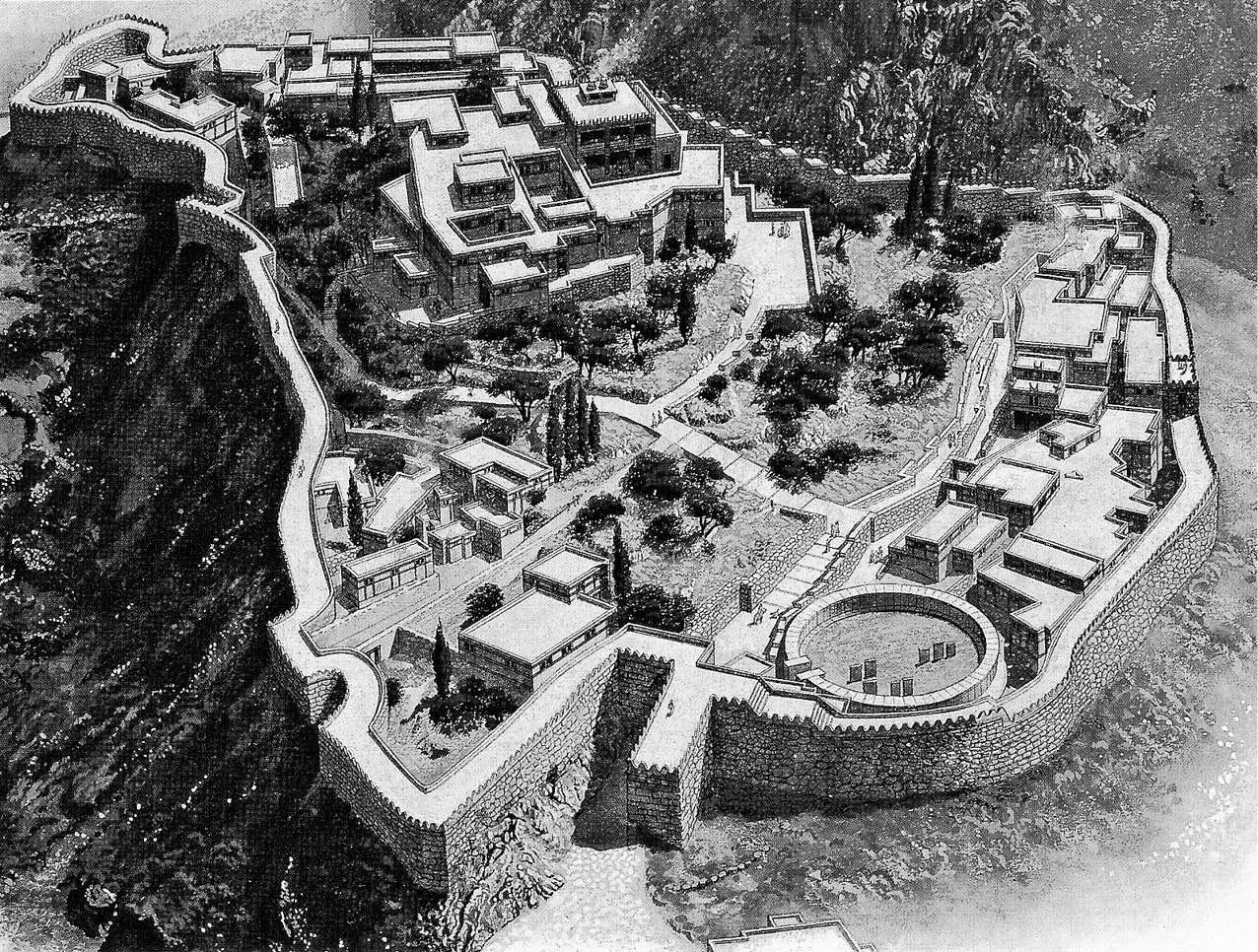 La capital del reino de Josías (640-609) era Jerusalén, un pueblecito de unos quince mil habitantes medio defendido por una muralla que aprovechaba el barranco del torrente Cedrón. No sería gran cosa, pero era lo mejor que tenían. Allí instalaron las dos grandes instituciones del Estado: el palacio del rey Josías, no mayor que un chalecito moderno, y el único templo donde podía sacrificarse a Yahvé, una construcción modesta que cabría holgadamente dentro de una de esas iglesionas que encontramos en los pueblos de España.139