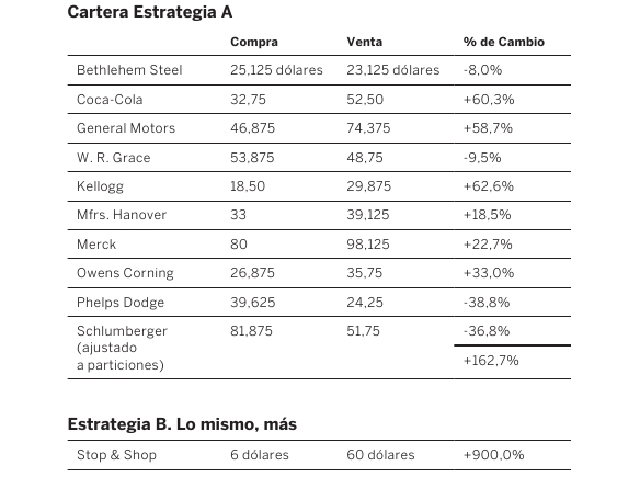 El resultado de la estrategia A es que sus 10.000 dólares se habrían convertido en 13.040 dólares, lo que significa unas mediocres ganancias totales del 30,4 por ciento en tres años (el S&P 500 ofreció unas ganancias totales del 40,6 por ciento a lo largo del mismo período). Usted tendría todo el derecho a decir: «Ya ves. Mejor dejo lo de invertir a los profesionales». Pero si hubiera añadido Stop & Shop al paquete, sus 10.000 dólares se habrían más que doblado, hasta convertirse en 21.060 dólares, lo que supondría para usted unas ganancias de 110,6 por ciento y la posibilidad de sacar pecho ante Wall Street (véase la página 42).