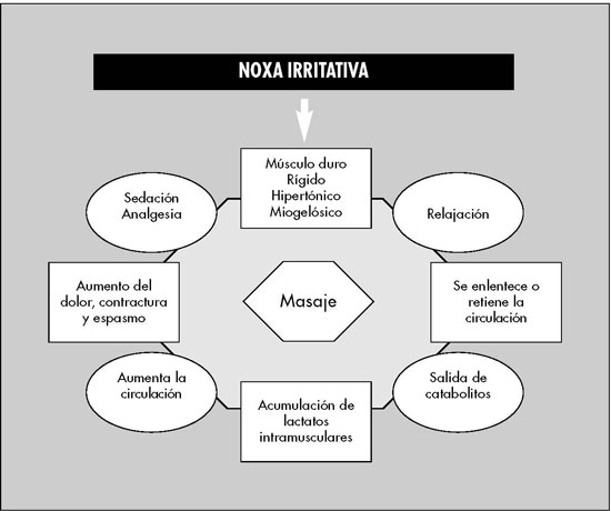 En el músculo espástico y contracturado, doloroso, el masaje consigue reducir o anular la contractura y el espasmo. Subjetivamente el paciente observa reducción del dolor y de la sensación de “acalambramiento”.