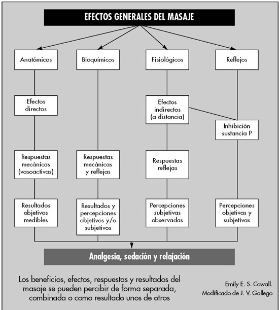 De los efectos generales del masaje, especialmente de sus efectos favorables más solicitados, como son los anal-gésicos, relajantes y emocionales, ya se ha hablado al describir el “masaje, dolor y analgesia”. Los efectos finales del masaje suponen una compleja serie de interrelaciones y mecanismos entrelazados que podrían resumirse como consecuencia de estas acciones que se suman y complementan: