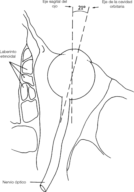 El globo ocular no está en contacto con las paredes, sino separado por distancias fijas (por ejemplo: 6 milímetros de la pared externa y 11 de la interna). Su eje anteroposterior, sensiblemente sagital, forma, con el eje anterosagital, un ángulo de 21 grados. Esta configuración explica los diferentes componentes de acción de los músculos oculomotores y la necesidad de una armonía perfecta en el funcionamiento musculofacial orbitario (cf. capítulo 4) (fig. 9).