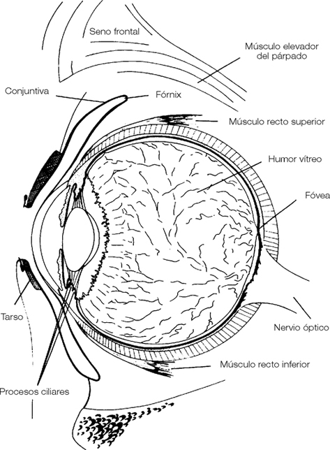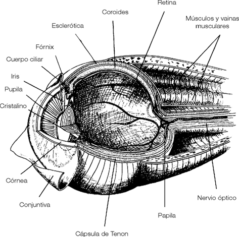 El ojo del globo ocular, ovoide, de 25 milímetros de diámetro sagital, consistencia muy firme debido a la tensión de sus líquidos internos, sólo ocupa la mitad anterior de la órbita. Está separado de la parte posterior, que contiene el complejo vasculonervioso, muscular y adiposo, por un elemento fibroso importante: la cápsula de Tenon, de la que hablaremos en el capítulo 5.
