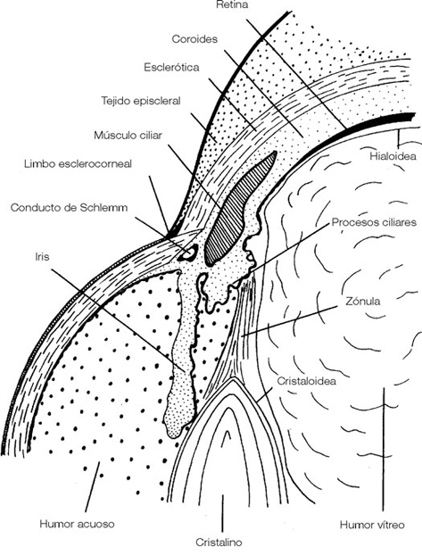4. El humor acuoso: se presenta como una substancia fluida, límpida y transparente que ocupa las 2 cámaras, anterior y posterior, del ojo. Este líquido, de composición electrolítica parecida a la de la linfa, pero de viscosidad ligeramente diferente, es elaborado por la filtración sanguínea de los vasos del iris y de los procesos ciliares en la cámara posterior. El humor acuoso pasa a la cámara anterior y es reabsorbido en parte por el conducto de Schlemm, situado en el ángulo corneoiriano; a continuación, es recogido por las venas episclerales, pero sobre todo por los espacios perilinfáticos que rodean el conducto de Schlemm y por las vainas linfáticas perivasculares de las venas ciliares. Su débito medio es unos 2,2 milímetros cúbicos por minuto.
