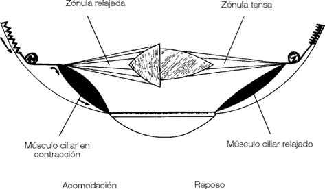 Esta acomodación es posible gracias a la contracción de los músculos ciliares dependientes de las fibras parasimpáticas del III nervio craneal (procedentes del núcleo de Edinger-Westphal): la contracción de los músculos ciliares relaja la zónula y la cápsula del cristalino (cristaloidea), lo que permite la distensión y el abombamiento del cristalino. En la acomodación, el radio de curvatura de la cara anterior del cristalino que era de 11 o 12 milímetros en reposo, puede disminuir hasta 6 ó 7 milímetros, mientras que el radio de curvatura de su cara posterior se modifica muy poco (de 6 milímetros en reposo a 5,5 milímetros). Este fenómeno de acomodación se produce a la par con el fenómeno de diafragmación (fig. 14).