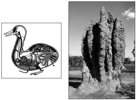 Figura 1.2. Reduccionismo y emergencia. La visión cartesiana del mundo imaginaba todo sistema como reducible a un conjunto de partes independientes que definirían una máquina, algo así como un autómata (a la izquierda, la ilustración muestra el célebre ánade de Vaucauson). Las construcciones llevadas a cabo por las termitas (derecha) ilustran a la perfección la existencia de propiedades emergentes. Si bien los individuos carecen de la capacidad de diseñar o construir estas estructuras, el superorganismo formado por la colonia sí posee esta capacidad. (Fotografía reproducida por cortesía de Brian von Yee Yap.)