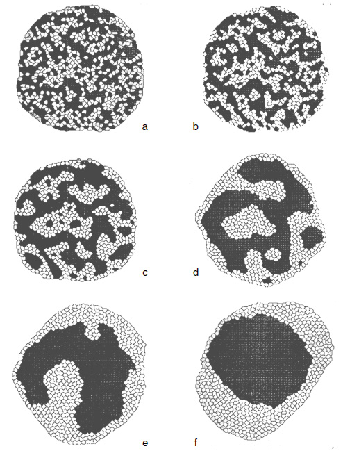 Figura 1.6. Autoorganización de tejidos virtuales. En esta secuencia vemos cómo una masa inicial (a) compuesta de dos tipos de células (indicadas por elementos blancos y negros) cambia en el tiempo (b-f) mostrando una segregación constante entre ambos tipos, que forman conjuntos separados, si bien al final uno engloba al otro (f). Este proceso es el resultado de interacciones celulares en las que los grupos homogéneos son más estables. (Imágenes de James Glazier.)