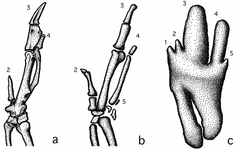 Figura 1.7. La presencia de los procesos de formación de una extremidad completa con cinco dedos, que se daba en los dinosaurios y que se transformó a lo largo de la evolución de las alas de las aves, se pone de manifiesto durante el desarrollo de un embrión de pollo. Los dibujos (adaptados de Nikbakht y McLachlan, 1999) presentan varios estados del desarrollo del ala de pollo. Aquí vemos: (a) el ala del adulto, que presenta tres dedos fusionados, (b) el ala del embrión a los ocho días, con cuatro dedos visibles y (c) el mismo sistema en etapas muy tempranas, en el que se aprecian cinco condensaciones óseas correspondientes a los cinco dígitos.