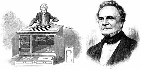 Figura 1.1. El Turco (izquierda) en un grabado de 1784, y uno de sus más famosos admiradores (y críticos): el matemático inglés Charles Babbage (1871), inventor de la primera calculadora mecánica. Ambas ilustraciones aparecieron en el Illustrated London Newspaper.