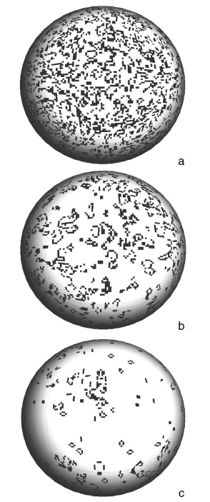 En lugar de hacer un experimento con un tablero de ajedrez, traslademos las reglas a nuestro ordenador (existen muchas páginas en internet que simulan el juego) y veamos qué ocurre. El lector estará de acuerdo con que las reglas son de una simplicidad ridícula. No resulta evidente qué puede ocurrir cuando dejamos que las reglas actúen y hagan su trabajo, cambiando nuestra configuración inicial. Pero se trata de un sistema que crea y destruye elementos, así que lo más probable es que acabemos obteniendo una población de piezas estable. Estas expectativas son correctas: el juego genera cambios que hacen que el número de elementos se reduzca al principio hasta alcanzar un treinta por ciento del total, aproximadamente. En la figura 1.4 vemos un ejemplo de los cambios que se dan en el sistema sobre un tablero en el que hemos colocado al azar cierto número de partículas vivas (casillas negras) y hemos seguido sus cambios en instantes sucesivos. Para visualizar mejor el comportamiento, hemos empleado una proyección del tablero sobre una esfera. La primera imagen (figura 1.4a) representa el momento inicial, en el que tenemos partículas vivas esparcidas al azar. Al poco tiempo (figura 1.4b) observamos una menor densidad y grupos de agregados de partículas que se definen cada vez más (figura 1.4c) y alcanzan un estado que, aunque variable en el tiempo, parece mantener cierta estructura básica. Si seguimos observando la evolución, después de un periodo más o menos largo se alcanza un estado en el que un conjunto de formas permanece estable. Algunos ejemplos de estas estructuras se muestran en la figura 1.5a-e. Entre las formas que genera el programa se encuentran algunas que son estáticas y no cambian una vez alcanzadas, mientras que otras siguen secuencias de cambios periódicos. Entre estas últimas tenemos varias formas que presentan dos estados alternativos mientras que otras, como los llamados «deslizadores», cambian regularmente mientras vuelan sobre el tablero, desplazándose a velocidad constante.