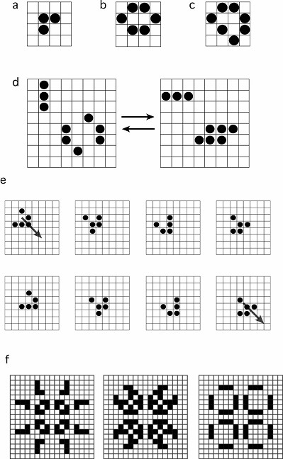 Figura 1.5. Diversos ejemplos de los cambios de estado de una pequeña parte de un tablero sobre el que evolucionan los autómatas celulares siguiendo las reglas del Juego de la Vida de Conway. Aquí las casillas «vivas» están ocupadas por círculos mientras que las «muertas» están vacías. Los ejemplos a-c son pequeñas estructuras estables, que no cambian con el tiempo. Las figuras (d) y (e) muestran secuencias de cambios oscilatorios (d) o de movimiento direccional (e) de un deslizador. En (f) se muestra un ejemplo de estructura oscilatoria de tres estados y mayor tamaño. (Gráficos de Ricard Solé)