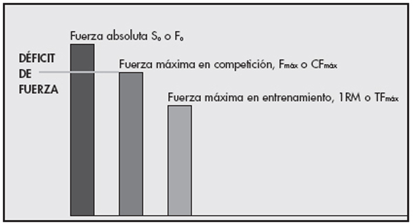 Por las razones precedentes, este texto distingue cuidadosamente entre el entrenamiento con pesas para producir efectos funcionales del entrenamiento y para producir efectos estructurales. Al determinar si un deportista requiere un tipo específico de entrenamiento con pesas, es útil introducir el concepto de déficit de fuerza (Fig. 1.1), que se define como la diferencia entre la fuerza máxima (esfuerzo voluntario) producida en una determinada acción y la fuerza absoluta (esfuerzo involuntario) de la que el atleta es capaz en esta misma acción. Este déficit puede definirse bajo condiciones estáticas o dinámicas, dependiendo el déficit del ritmo al que la fuerza debe ser desarrollada en una determinada acción articular.