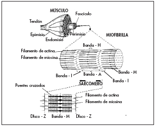 El músculo esquelético comprende cientos o miles de pequeñas fibras, cada una rodeada en niveles de tamaño sucesivos por una vaina de tejido conectivo abastecida por fibras nerviosas, junto con un rico suministro de sangre. Cada una de las fibras musculares está rodeada por una vaina llamada endomisio. Varias de estas fibras se agrupan para formar unos haces, llamados fascículos, encerrados en sus propias vainas o perimisio. Grupos de estos fascículos forman el total del músculo, que se encuentra dentro de una fuerte vaina llamada epimisio o fascia (fig. 1.10).