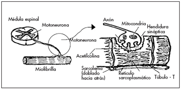 Los nervios que suministran la estimulación se denominan motoneuronas. Sus cuerpos célulares se localizan en el cerebro o en la columna vertebral y envían largos cables (axones) a determinadas células musculares. Las terminaciones de estos axones se dividen en varias terminales al entrar en el músculo, cada terminal forma una unión neuromuscular con una única fibra muscular (fig. 1.12). Esta unión o sinapsis comprende un espacio muy estrecho relleno de líquido o hendidura sináptica entre las membranas de la terminación axonal y la fibra muscular. El impulso eléctrico provoca que las vesículas sinápticas (vasos) dentro de la terminación axonal liberen una sustancia transmisora (un neurotransmisor) especial denominada acetilcolina que se traslada a través de la hendidura y da la señal al retículo sarcoplasmático para liberar los iones calcio.
