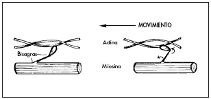 Para comprender el mecanismo de la contracción muscular, resulta útil empezar por el análisis de la construcción de las fibras individuales. Cada molécula de filamento grueso (miosina) dentro de un sarcómero consiste en una cola en forma de vara (compuesta de meromiosina fina de doble hilo) doblada por un extremo para formar un cuello globular doble (compuesto de meromiosina de doble hilo) y una cabeza (hecha de dos masas proteicas globulares). Se considera que existen dos regiones muy flexibles en la base del cuello y en la base de la cabeza denominadas bisagras, que permiten a las protrusiones de cabeza/cuello flexionarse y extenderse sobre unas distancias relativamente grandes cuando interaccionan con las uniones de actina vecinas. Unas 200 de estas moléculas, aproximadamente, se unen para formar un filamento de miosina con las protrusiones de cabeza/cuello situadas a los lados del filamento (fig. 1.11). Son estas protrusiones las que constituyen los puentes cruzados.