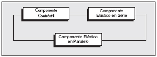 Todo músculo comprende un componente contráctil, un sistema de actina-miosina, y un componente no contráctil, el tejido conectivo. En términos mecánicos, el músculo puede ser analizado de forma más detallada (de acuerdo con Levin y Wyman, 1927) en términos de un componente contráctil en serie, con un componente elástico en serie (CES); y, en paralelo, con un componente elástico en paralelo (CEP), tal y como se ilustra en la figura 1.14. A pesar de no haberse identificado la precisa situación anatómica de estos elementos, el CEP contiene probablemente sarcolema, puentes cruzados en reposo y tejidos como membranas alrededor del músculo y sus sub-unidades. Por otro lado, se considera que el CES incluye tendón, puentes cruzados, miofilamentos, filamentos de titina y discos-Z. De todos estos elementos, los miofilamentos probablemente proporcionan una mayor contribución al CES (Suzuki y Sugi, 1983).