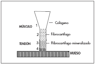 El tendón difiere del ligamento en el hecho de que sólo una terminación se inserta en el hueso, mientras que en la mayoría de los ligamentos ambas terminaciones se insertan en el hueso. La transición de tendón a hueso no está tan bien definida como en el ligamento, y, en breve, el tendón se inserta en la principal membrana fibrosa del periostio. Sin embargo, tal y como sucede en los ligamentos, se puede identificar el mismo tipo de transición gradual en cuatro zonas desde el colágeno hasta el hueso (fig. 1.15). Esta estructura minimiza los efectos negativos de un estiramiento o una carga súbita que se podrían producir si hubiera una brusca transición de músculo a colágeno y después a hueso.