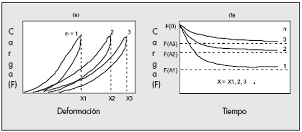 Es importante destacar otro fenómeno de la carga. Por ejemplo, si el tejido de colágeno se examina a través de la imposición de series sucesivas de ciclos de carga-descarga con un período de descanso de 10 minutos entre cada ciclo, se describirán unas curvas como las indicadas por n = 2 y 3 en la figura 1.17. La figura 1.17a muestra que la región inicial en forma de «dedo del pie» aumenta su extensión, mientras las curvas de la histéresis se desplazan progresivamente hacia la derecha. Al mismo tiempo, las curvas de relajación en tensión de la figura 1.17b se desplazan en sentido ascendente. Si el test se repite indefinidamente, la diferencia entre las curvas sucesivas disminuye y final-mente desaparece. En esta situación se dice que el tejido ha sido pre-condicionado, un estado que se consigue debido a la estructura interna del tejido se altera con los ciclos. Este tipo de acondicionamiento con el propósito de asegurar cierta estabilidad es el objetivo de los ejercicios de estiramiento.