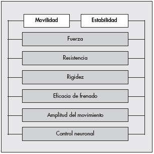 El principio fundamental del movimiento animal se basa en que toda actividad es el resultado de un equilibrio entre estabilidad y movilidad en el cuerpo. Todo deporte, y su entrenamiento, conllevan el aprendizaje y la perfección de procesos que facilitan la adecuada y efectiva interacción de los mecanismos estabilizadores y de aquellos que movilizan las articulaciones en cada instante durante una determinada actividad. Tal y como se argumenta en la siguiente sección, algunos músculos tienen una función fásica como movilizadores primarios o movilizadores asistentes, mientras que otros tienen una función tónica o postural como estabilizadores. En algunas ocasiones se intercambiarán las funciones de los músculos para determinadas actividades, conviertiéndose los estabilizadores en movilizadores y viceversa. El equilibrio entre estabilidad y movilidad depende de la integración neuromuscular de factores como la fuerza, la resistencia y la amplitud del movimiento, así como de las propiedades mecánicas de los tejidos involucrados (en particular, la rigidez mecánica y la ratio de frenado). Este proceso se resume gráficamente en la figura 1.19.