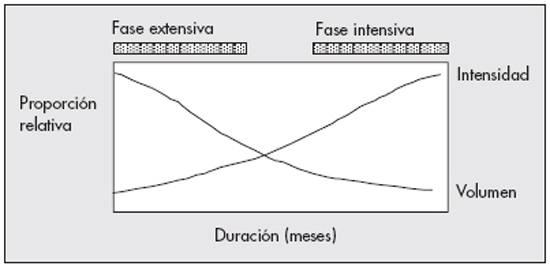 Los métodos que conllevan un gran volumen de entrenamiento (muchas repeticiones con cargas ligeras) se conocen como métodos extensivos y cualquier periodo basado en un elevado volumen de entrenamiento de pesas suave se denomina fase de extensión o acumulación. Por el contrario, los métodos con una elevada intensidad y un bajo volumen se conocen como métodos intensivos, y un periodo que contiene este tipo de entrenamiento se conoce como fase de intensificación. Los primeros estadios del entrenamiento normalmente empiezan con una fase extensiva con el objetivo de establecer los fundamentos para unas mayores demandas impuestas por la fase intensiva subsiguiente, con una gran resistencia y pocas repeticiones (fig. 1.3). De hecho, el sistema de entrenamiento a largo plazo conocido como periodización se basa en la alternancia cíclica de fases extensas e intensivas del ejercicio escogidas para mejorar oportunamente determinados componentes de la condición física como la fuerza, la fuerza-rápida y la fuerza-resistencia (ver cap. 5 y 7).