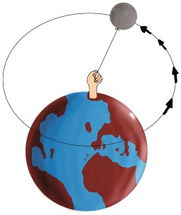 Este hecho cotidiano, del que hemos sido testigos desde niños, revela una de las claves fundamentales para entender el funcionamiento a gran escala del cosmos y, de paso, ayudar a nuestro amigo a olvidar cuanto antes a su amada. Para ello, hemos de pensar un momento en la Luna. Si nos fijamos, el movimiento lunar guarda ciertas similitudes con el de nuestro ejemplo. En ambos casos, algo gira en torno a algo; una piedra alrededor de una mano, o la Luna en torno a la Tierra. Pero inmediatamente advertimos el problema.
