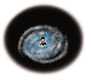 En la imagen podemos ver la Vía Láctea, nuestra región del cosmos. Doscientos mil millones de soles giran alrededor del centro galáctico, obedeciendo a las leyes del movimiento que descubrió Isaac Newton. Si nos ponemos tontamente metafóricos, podemos decir que doscientos mil millones de cuerdas invisibles son agarradas por la mano de un niño pequeño en el centro galáctico. Pero si somos precisos, escribiremos simplemente que la fuerza de atracción gravitatoria mantiene la galaxia unida en movimiento circular.