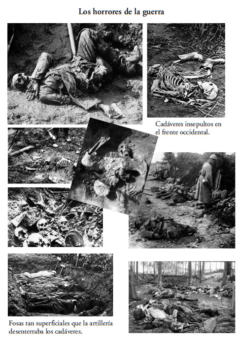 Ametralladoras y alambradas parecen haberse confabulado para quebrantar esos sueños. ¿Cómo anularlas? Mediante una adecuada preparación artillera. Durante casi tres años, los generales repetirán la misma táctica: primero acumulan considerables cantidades de artillería, cañones de todos los calibres, reservas inmensas de granadas; después, bombardean las trincheras enemigas durante horas o, mejor, durante días: cientos de miles de granadas si fuera necesario, un auténtico despilfarro. El resultado son algunos kilómetros de tierra abrasada a uno y otro lado del frente en los que no crece vegetación alguna, un yermo sembrado de restos de metralla y de casquería humana o animal: hombres y bestias de carga despedazados.