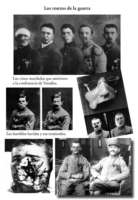 La metralla provoca gran cantidad de mutilados cuyo tratamiento hará progresar notablemente la cirugía plástica, aunque de esos remiendos apresurados resulten rostros horribles que, a menudo, deben ocultarse detrás de máscaras que los afectados usarán de por vida. Otra consecuencia de la despiadada guerra de trincheras es la gran cantidad de adictos a la morfina o al alcohol, que después de la contienda tendrán graves problemas de adaptación en la sociedad civil.