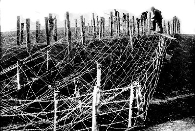 Alambradas delante de una trinchera.