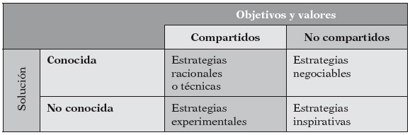 El principio de este intento de clasificación es mostrar que el nivel de incertidumbre sobre la capacidad de resolver el problema colectivo, y el nivel en que se comparten los objetivos a perseguir y, antes aún, el compartir que exista un problema a resolver, tienen consecuencias fundamentales que conciernen a las modalidades mediante las que es posible intentar afrontar la elección a tomar por parte de los actores.