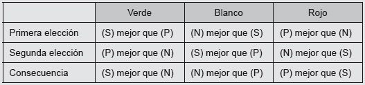 Se encarga a una comisión tomar una decisión sobre cuál es la tecnología más adecuada para la producción de energía eléctrica, escogiendo entre energía solar (S), energía nuclear (N) o combustibles fósiles como el petróleo (P). Son llamados a formar parte de la comisión un representante de los ecologistas que llamaremos Verde, un representante de la comunidad de los tecnólogos que llamaremos Blanco y un economista que llamaremos Rojo. Se trata de tres personas racionales que saben bien que quizás no lograrán hacer prevalecer su punto de vista y que, por lo tanto, es conveniente no tener sólo una opción, sino también una segunda elección para aumentar la probabilidad de evitar la que cada uno de ellos considera la más negativa. Verde, razonando desde la lógica del desarrollo sostenible, prefiere sin duda las energías renovables, esto es, la solar respecto a los combustibles fósiles, pero prefiere el petróleo a la nuclear, que conlleva, des de su punto de vista, importantísimos riesgos. Blanco, en cambio, en una lógica de desarrollo tecnológico e industrial, prefiere la elección nuclear a la solar, pero de todos modos ve con simpatía ésta última, por las potencialidades de evolución que presenta con relación al uso del petróleo, que se basa en tecnologías ya superadas. Finalmente, Rojo, que razona exclusivamente desde el coste del kW/hora producido, piensa que en la situación actual el uso del petróleo es más eficiente que el desarrollo de la energía nuclear, que conlleva inversiones elevadísimas pero, en cualquier caso, piensa que esta última es mucho mejor que la energía solar, gravemente ineficiente desde el punto de vista económico. La tabla siguiente sintetiza las posturas.
