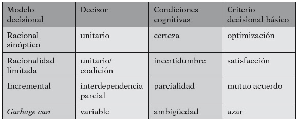 En las páginas siguientes presentaremos cuatro modelos decisionales distintos. Con este término entendemos «una construcción analítica que establece los elementos esenciales» del proceso de toma de decisiones. O sea, «el decisor, sus recursos cognitivos, las actividades de búsqueda de las soluciones, las modalidades y los criterios de la decisión y sobre todo [...] las relaciones que existen entre esos diversos elementos» (Bobbio, 1996, p. 13).