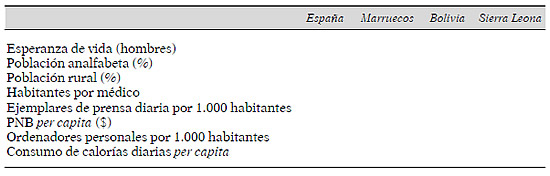 Completando las dos tablas que siguen, se comprobarán las diferencias existentes, tanto internas —dentro de una misma comunidad— como externas —entre comunidades—. La comparación entre un país avanzado —como España— y un país en vías de desarrollo—como Sierra Leona— nos revela todo tipo de desigualdades (cfr. tabla I.1.1). Por su parte, las diferencias de renta en el interior de un mismo país expresan desigualdades en el acceso a recursos de todo tipo: educación, salud, cultura, calidad de la vivienda, etc. Para obtener los datos, se sugiere recurrir a: