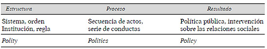 En el mundo angloparlante es más fácil diferenciar las tres perspectivas. Para cada una de ellas se suelen emplear tres términos diferentes: polity (la estructura), politics (el proceso) y policy (el resultado). Cuando las lenguas románicas intentan evitar esta dificultad semántica, la solución es emplear, respectivamente, las expresiones política, sistema político y política pública. Los puntos de contacto entre estas referencias pueden expresarse en un esquemático cuadro de equivalencias.