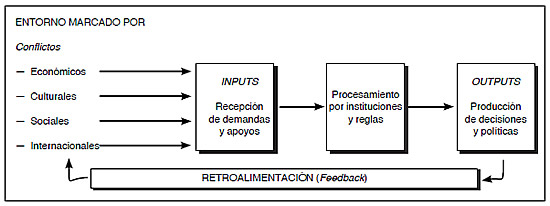 • describe una secuencia ideal —aportación de inputs, procesamiento, elaboración de outputs, retroalimentación— que permite poner un cierto orden en la pluralidad y diversidad de intervenciones políticas;