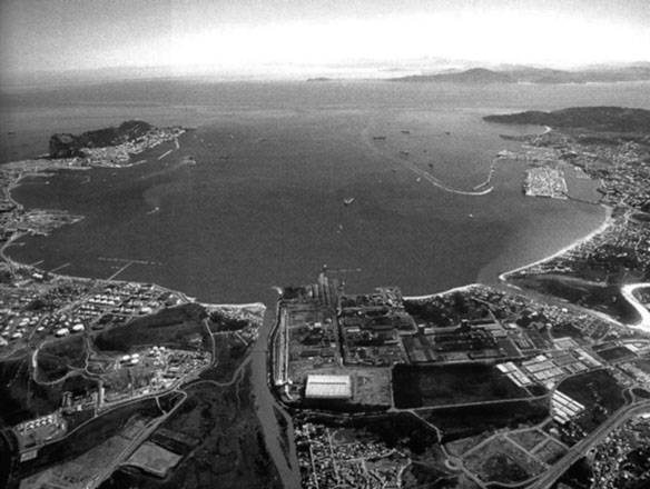 FIG. 1. Vista aérea de la Bahía de Algeciras con el Peñón de Gibraltar y la costa del norte de África. En primer término el yacimiento de Carteia. (Foto Proyecto Carteia 2003).