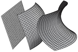 FIGURA 9. Curvatura de una superficie. A la izquierda: curvatura cero. En el centro: curvatura positiva. A la derecha: curvatura negativa.