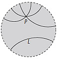 FIGURA 10. Círculo modelo del plano hiperbólico. Las tres líneas que pasan por P no se cruzan con L.