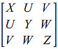 Aquí X, Y, Z, U, V, W pueden depender de x, y y z. Puede parecer un poco un trabalenguas, pero, como la ecuación de Pitágoras, encierra sumas de cuadrados (y productos muy relacionados de dos cantidades como dx dy) más una cuantas florituras extra. Lo segundo se da porque la fórmula puede representarse como una tabla o matriz 3 × 3: