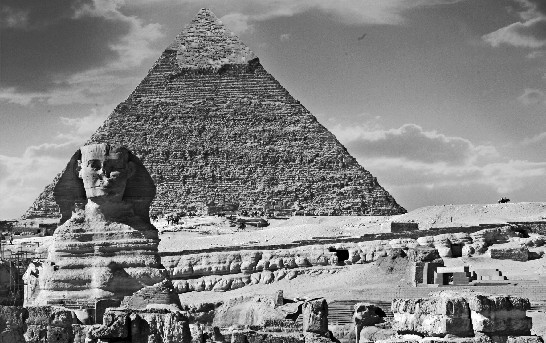 Figura 2.6. Tanto esfinge como pirámide son palabras de origen griego, no egipcio. La sphinx griega era un animal fabuloso. Y la pyramís era un pastel de harina de trigo (pyrós) con forma piramidal.