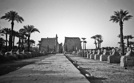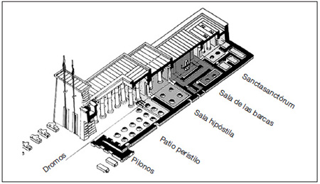 Figura 2.8. Un dromos o avenida, flanqueada por esfinges, conduce a un pilono ante el que se alzan varias estatuas colosales y un obelisco y que da a un patio peristilo. Las seis palabras son griegas.