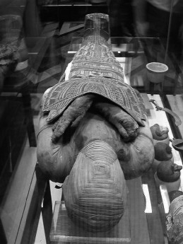 La palabra momia es otro internacionalismo, pero esta vez no viene del egipcio, sino del árabe. Según la Academia (y también según Corominas, con alguna variante en cuanto a los signos diacríticos), esta palabra procede «del árabe clásico mū miyā », bitumen de embalsamar cadáveres, y a su vez este término árabe vendría del persa mum, ‘cera’, ‘betún’. Por metonimia, esa palabra pasó de designar a la «sustancia bituminosa que empleaban los antiguos para embalsamar» muertos a designar al propio muerto. Y, para finalizar, un derivado castellano (bastante lógico, por cierto): la palabra momio aún se usa como equivalente a ‘magro’, ‘sin gordura’. ¡Normal, las momias tienen la carne sin gordura alguna! En egipcio antiguo, la momia era shah o sah. (Véase Figura 2.16).